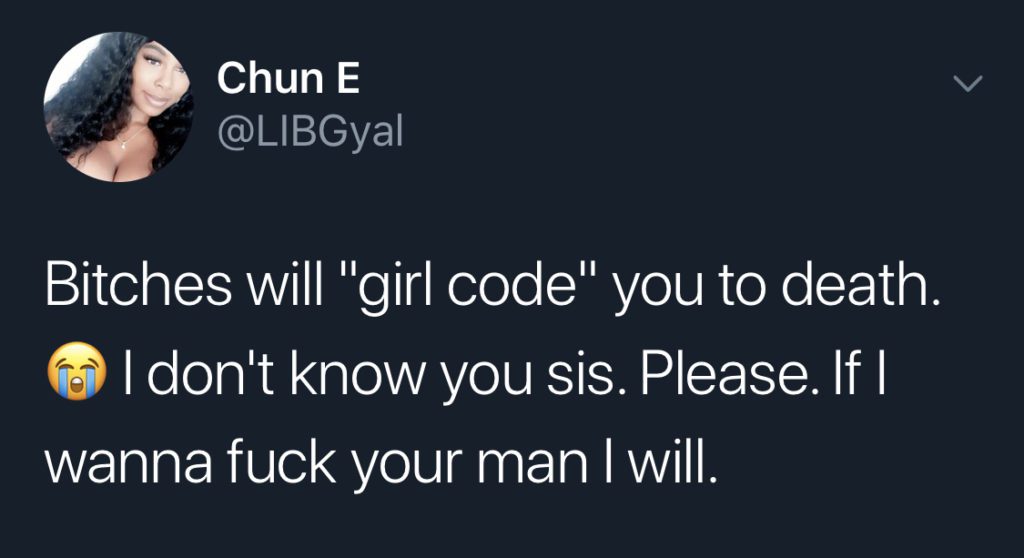 I know… karma, morals, he cheated on her he’ll do the same thing to you blah blah blah. You know who says that—scared bitches. It’s survival of the fittest, if his girl isn’t strong enough to keep a hold on him, then that’s her fault.