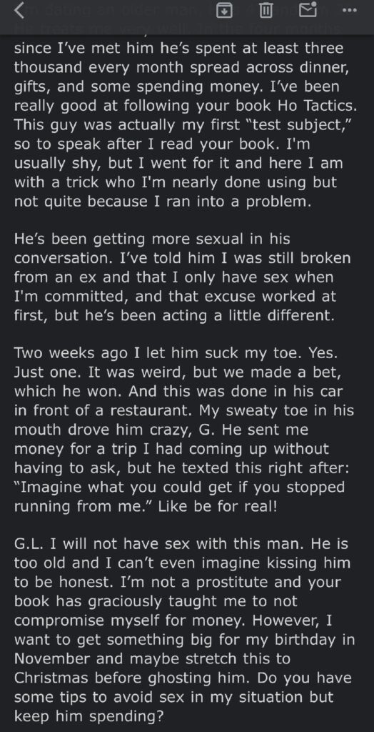 You are not pussy. You are a Spartan. To fall for a man who is trying to buy his way between your legs proves that you're easy, naive, and destined to get ran through not run things. The rule of the game is not to get used when getting treated! It's not "tricking" if you're giving him sex. It's not spoiling if he's getting more out of the deal than you are.